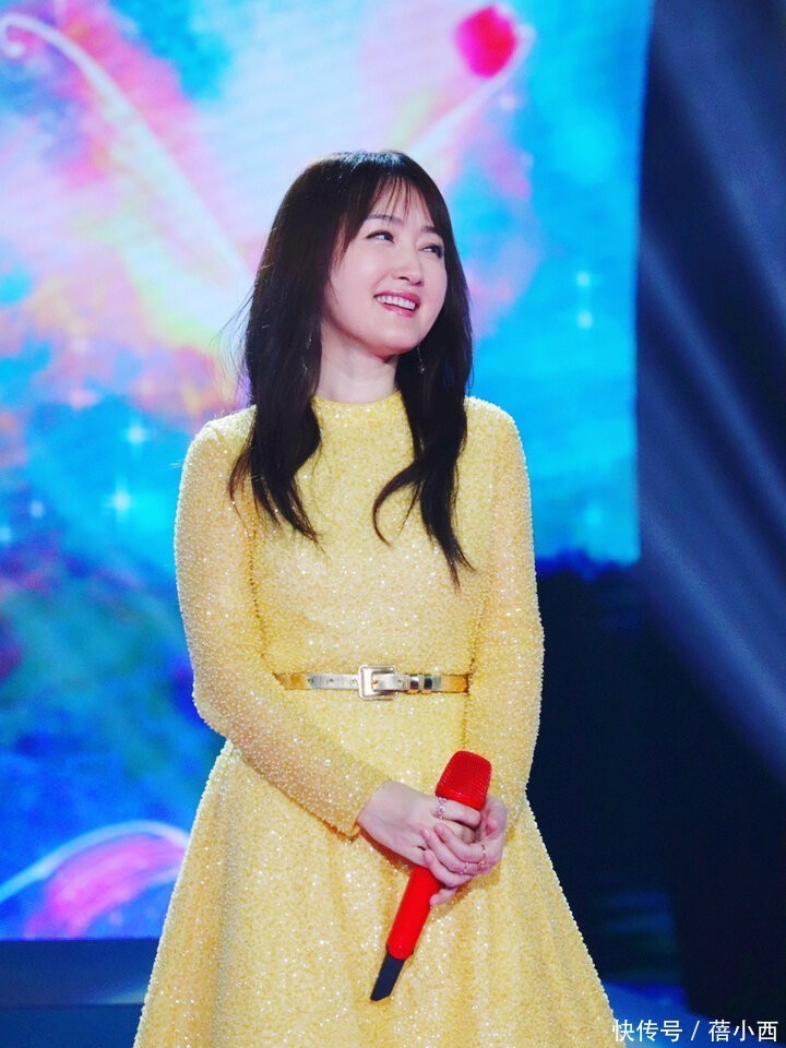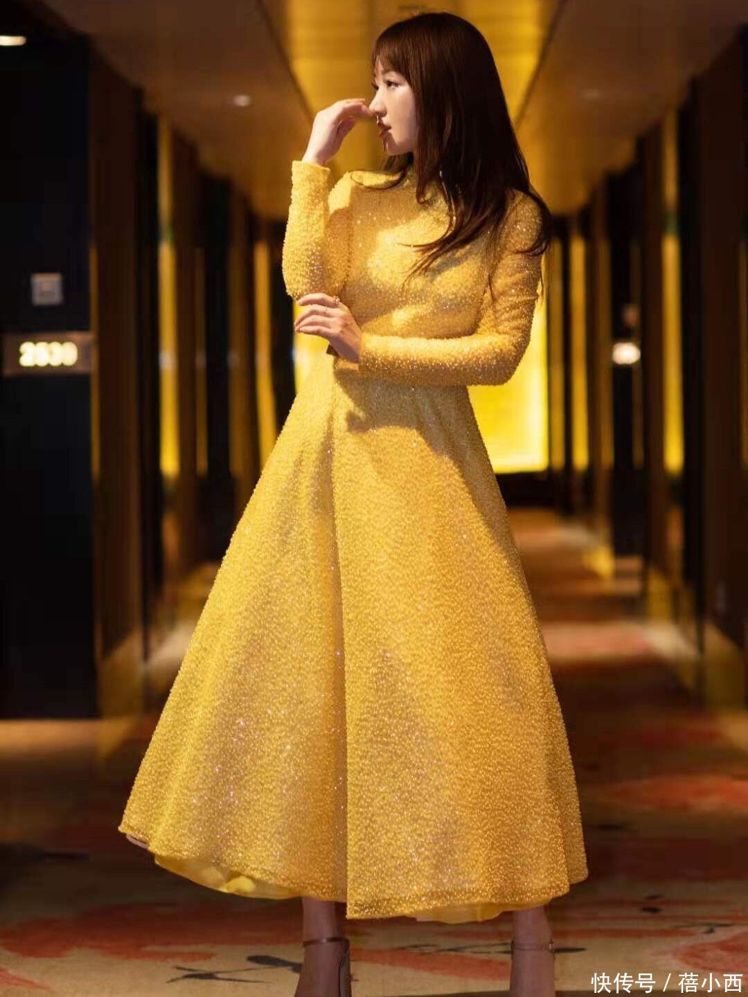 再看这条黄色亮片连衣裙,简直是为她量身定制的。高领设计衬得脖颈修长,长袖款式优雅又端庄,特别适合她温婉的气质。